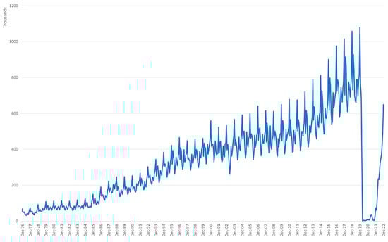 Several research works have successfully employed Internet data to forecast the demand for hotel rooms and flights for different forecasting horizons [6,7,8,32]. Similar to unemployment forecasting, tourism research has been extended to predict the volume of visitors to cities [33,34] and countries [5,9,10,25,26]. Their results presented higher accuracy when incorporating search data. A limited number of those research works focused on the volume of incoming visitors regardless of their point of departure and did not evaluate the performance of other techniques.