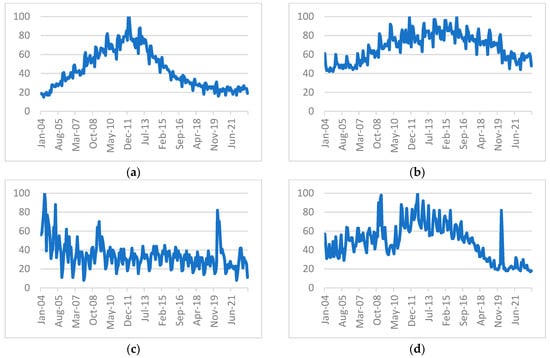 Popularity of certain Google indicators over time: (a) Seek (b) jobs (c) unemployment (d) Centerlink.