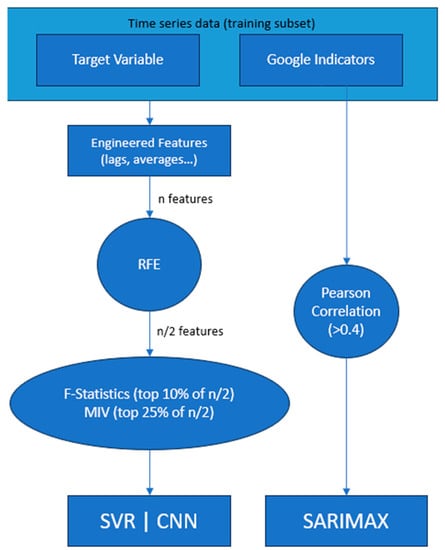 After engineering a wide range of features from the target variables and Google Trends indicators, we applied different feature-selection methods that incorporated recursive feature elimination (RFE) with mutual information (MI) and the f_test. These methods provided us with a robust and diverse perspective on feature importance. For the exogenous variables derived from Google Trends, we used the Pearson correlation to determine the most-relevant variables, which were used to train the SARIMAX model.