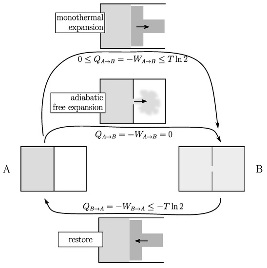 Note that the equality in Equation (2) gives us the only way to measure , in particular by using an infinitely slow process (i.e., reversible) to go back to the initial state (B→A). In our case, this corresponds to the compression of a piston from B to A that requires mechanical work and provides heat to the surroundings (ideally both with the same absolute value as for the expansion but with opposite sign). Using this restore process, the energy cost at the end of the cycle (A→B→A) is: