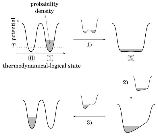 Note that as is, the bistable potential seems to be not convenient to fulfill the second condition, because there is nothing to do to RESET TO 0 in case the initial state is already at 0, while an energy barrier must be crossed otherwise. To overcome this problem, Landauer imagines the following functional procedure that follows three stages (Figure 2):