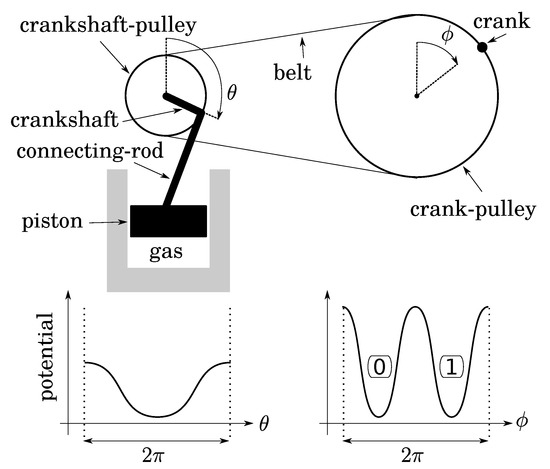 Let us fill a diathermal gas container below a piston at atmospheric pressure while the piston is at the position of maximum expansion. Then, close the container. This thermodynamical system is monostable when the piston is up (Figure 3). Let us link the piston to a connecting rod, a crankshaft, and a pulley of radius 1. A frequency divider is obtained with a belt and another pulley of radius 2 equipped with a crank, so that to the single stable position of the piston there correspond two stable positions of the crank (up and down in Figure 3 if the belt is initially closed while the two pulley angles are zero). The two crank positions define a bit whose thermodynamics depends on: (1) the expansion/compression of the gas; (2) the friction of the transmission. As both can be quasistatic, operations on this bit are too.