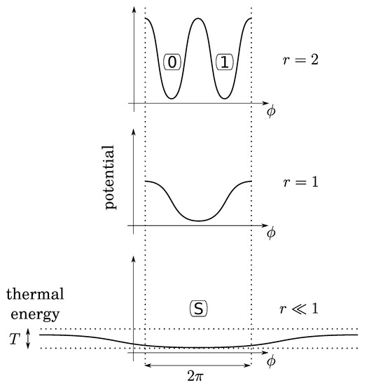 Before investigating bit operations, note that (1) due to conservation of energy, the height of energy barriers for the crank (logical barrier) increases linearly with the gear ratio crank/crankshaft, whereas that of the piston is constant (thermodynamical barrier); (2) the gear ratio can vary continuously by using a so-called “continuously variable transmission” mechanism, say, for instance, a conical pulley for the crank. So that there is no conceptual impossibility for this variation to be performed as slowly as desired in a fully controlled and quasistatic manner. It follows that, while the bit is initially at an equilibrium position (either 0 or 1), the gear ratio can be decreased enough so that the logical barrier becomes smaller than the thermal energy T (see Figure 4). Then, due to fluctuations of pressure below the piston, the position of the crank can fluctuate in any position between 0 and , leading to an undetermined bit value. We, thus, obtain a soft potential well (standard bit-state S), as in the papers of Landauer and Bennett [5,7].