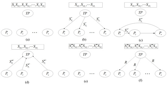 - Let represent n parties holding different private information , respectively, where . Being aided by a semi-honest TP, their primary aim is to determine if their respective secrets bear resemblance. The TP is allowed to exert effort in recognizing the content of the participants’ secrets, but it is prohibited from colluding with others.