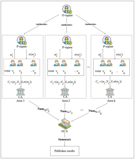 - Efficiency: In the e-voting system proposed in this paper, O-signer grants signature rights to the P-signer for each constituency by region, and the P-signers for each constituency sign the blinded ballots for the region under their jurisdiction at the same time, thus increasing the efficiency of voting.