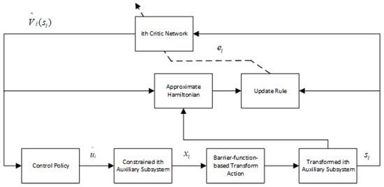 On the other hand, interconnected systems consist of multiple subsystems with interconnected characteristics, and designing controllers for them through a concept similar to that of a single-system approach is difficult [14]. To solve this problem [15,16,17], the decentralized control approach, based on local subsystem information, was proposed. This approach involved using multiple controllers to control the interconnected systems. In [18,19], the decentralized control approach differed by initially decomposing the entire system control problem into a series of subproblems that could be solved independently. The solutions to the subproblems (i.e., independent controllers) were then joined to form a decentralized controller to stabilize the entire system. In addition, implementing the decentralized control algorithm used only the local subsystem’s knowledge, not the complete system’s information. Recently, scholars have proposed many schemes or techniques for designing decentralized controllers, including quantization techniques [20], fuzzy techniques [21], and optimal control methods [22]. This paper develops decentralized control strategies from the optimal control perspective. Problems of optimal control are usually solved via the solution of the Hamilton–Jacobi–Bellman (HJB) partial differentiation equation [23,24]. However, the HJB equation is generally not solvable analytically due to its inherent nonlinearity [25,26]. Therefore, adaptive dynamic programming (ADP) and reinforcement learning (RL) algorithms were proposed to obtain numerical solutions to the HJB equation and were widely applied to nonlinear interconnected systems [27,28,29,30]. In [31,32], the two previously mentioned algorithms could be deemed closely related, as they exhibited similar characteristics in addressing optimal control problems. For example, in [27,28], the distributed optimal controller was designed using robust ADP for nonlinear interconnected systems with unknown dynamics and parameters. In [29], the optimal decentralized control problem for interconnected nonlinear systems subject to stochastic dynamics was solved by enhancing the performance function of the auxiliary subsystem and transforming the original control problem into a set of optimal control strategies sampled in periodic patterns. Furthermore, in [30], the identifier–critic network framework was used to solve the problem of decentralized event-triggered control based on sliding-mode surfaces, avoiding the need for knowledge of the system’s internal dynamics. It is worth noting that the control results provided in [27,28,29,30] did not consider input constraints.