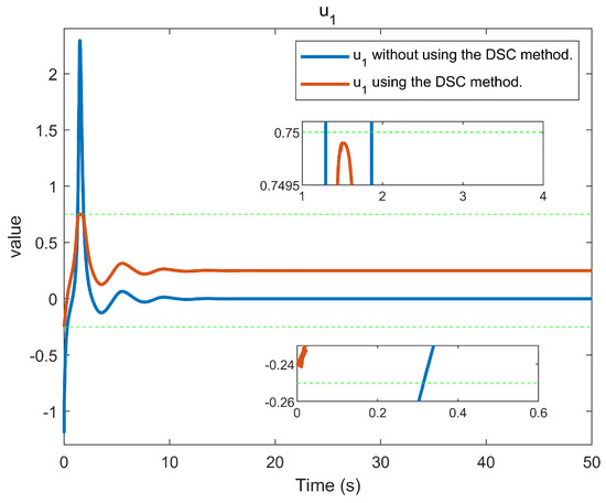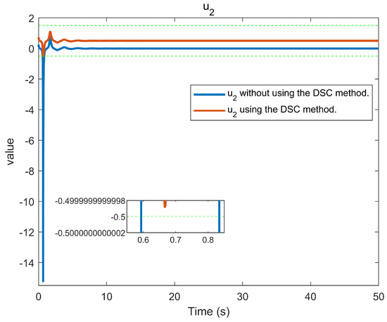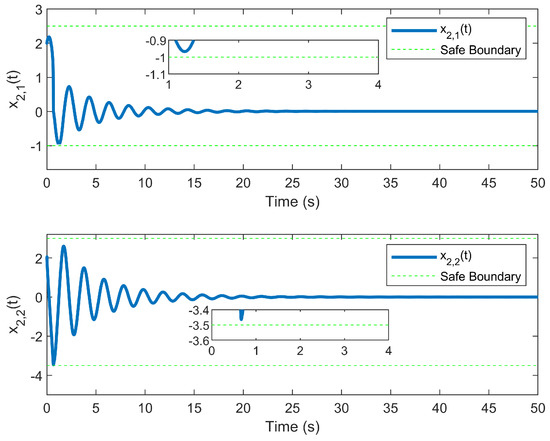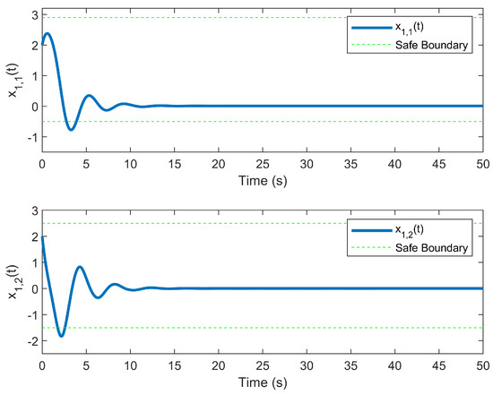 The simulation outcomes are presented in Figure 2, Figure 3, Figure 4, Figure 5, Figure 6, Figure 7, Figure 8, Figure 9, Figure 10, Figure 11, Figure 12 and Figure 13. The states of the system are depicted in Figure 2 and Figure 8, and it can be observed that the closed-loop system stabilized after 20 s and 35 s, respectively. However, the system failed to meet the specified security constraints. Figure 3 and Figure 9, shown in comparison with Figure 2 and Figure 8, not only assured that the system states converged to zero, but also satisfied the given safety constraints. The evolving states and are presented in Figure 4 and Figure 10, based on the safe control method with asymmetric input constraints. The optimal DSC policies are shown in Figure 5 and Figure 11. We found that the optimal DSC policies were restricted to the asymmetric set and . Figure 6 and Figure 12 represent the optimal auxiliary control strategies for subsystems 1 and 2, respectively. Figure 7 and Figure 13 show the critic updated laws. It can be observed that the weights converged after 15 s. According to Theorem 3, we concluded that the proposed optimal safety control policy and the auxiliary control policy could stabilize the closed-loop nonlinear system and satisfy the safety constraints on the system state. Moreover, the optimal control policy eventually converged to a predefined set of constraints. Finally, the results of the simulation showed that the presented optimal DSC solution for constrained interconnected nonlinear safety-critical systems, affected by system state constraints, is effective.