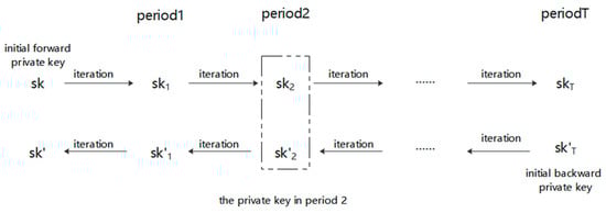 - Key iteration and update: When the user wants to use the private key, he initiates a key request to PKG and sends the identity together. PKG inputs the public parameters PP, master key msk, user initial key usk and user identity , then executes the algorithm to generate the initial forward private key and initial backward private key . When iterating the forward private key, user inputs the current period i, user identity and current forward private key , then outputs the forward private key for the next period i + 1. When iterating the backward private key, user inputs the current period i, user identity and current backward private key are input , then outputs the backward private key for the previous period i − 1. The private key of the i-th period is = , which is the result of concatenating the forward private key and the backward private key. The iteration process of the private key is shown in Figure 1.