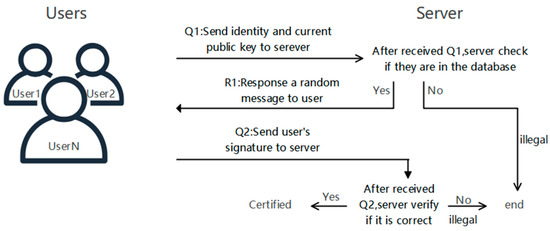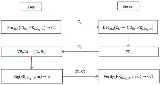 - After receiving the ciphertext sent by the user, the server decrypts it with the private key ssk to obtain the user’s and the public key of the current period , and then the server compares the user’s identity and public key in the database to see whether they are consistent with the stored ones. If they are consistent, continue 3, otherwise stop the interaction.
