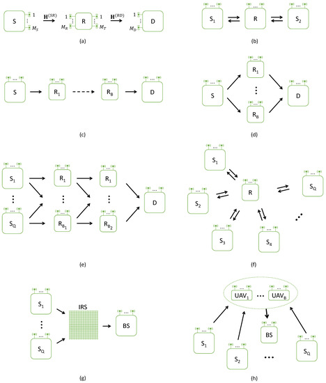 In Figure 3a–h, we present several architectures of relay-, IRS- and UAV-assisted communication networks. Figure 3a represents a conventional MIMO one-way two-hop relay system, composed of three nodes associated with a source (S) transmitting its information to a destination (D), via a relay (R), as in [21,22,23,24,25]. The source and destination nodes are equipped with and antennas, respectively, whereas the relay uses antennas for reception and for transmission.