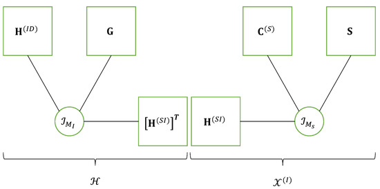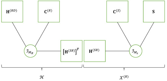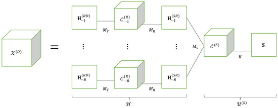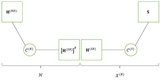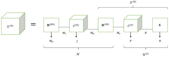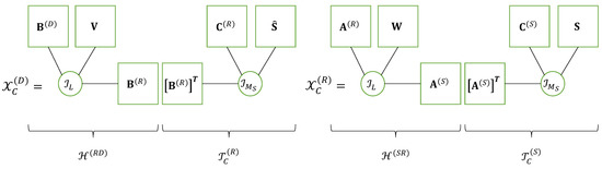 This equation is to be compared with (40) and (72). Since and satisfy two third-order CPD models sharing the matrix factor , Equation (74) can also be interpreted as a nested CPD model, as illustrated by means of Figure 10.