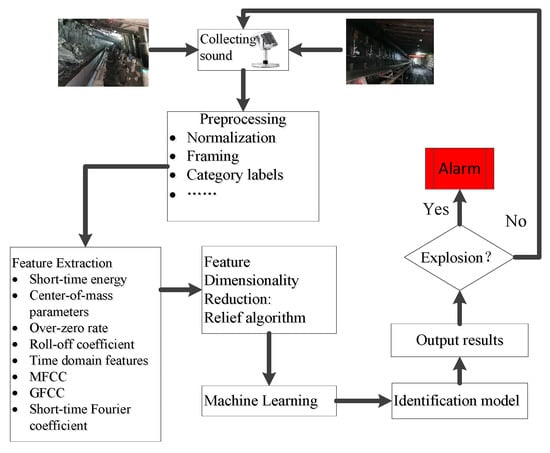 To further improve the accuracy of coal mine gas and coal dust explosion recognition, it is necessary to conduct in-depth research in coal mine gas and coal dust explosion sound recognition. Inspired by the research ideas of [15,16,17], we try to find a deep network suitable for actual coal mine production. Multi-layer perception (MLP) has the advantages of highly parallel processing, highly nonlinear global action, good fault tolerance, associative memory function, very strong adaptive and self-learning function, etc. Based on this, a sound identification method for gas and coal dust explosions based on MLP is proposed in this paper, which mainly includes the following aspects: (1) the real-time acquisition of sound signals in the monitoring area; (2) pre-processing of sound signals; (3) the extraction of the feature parameters of sound signals; (4) filtering less useful features by the Relief algorithm to achieve a reduction in the dimensionality of the extracted feature set; (5) establishing a machine learning recognition model; and (6) determining whether the sound is a gas and coal dust explosion by the model results. Working Principle Diagram is shown in Figure 1.