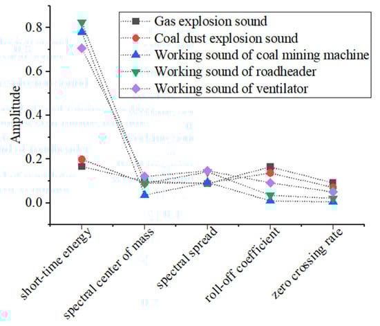 Due to the limitation of space, this paper will take the gas explosion sound, coal dust explosion sound, coal mining machine working sound, roadheader working sound, and ventilator working sound as the research objects by extracting the average values of five parameters, such as the short-time energy, spectral mass center, spectral diffusion, roll-off coefficient, and zero crossing rate, and the specific distribution is shown in Figure 2.