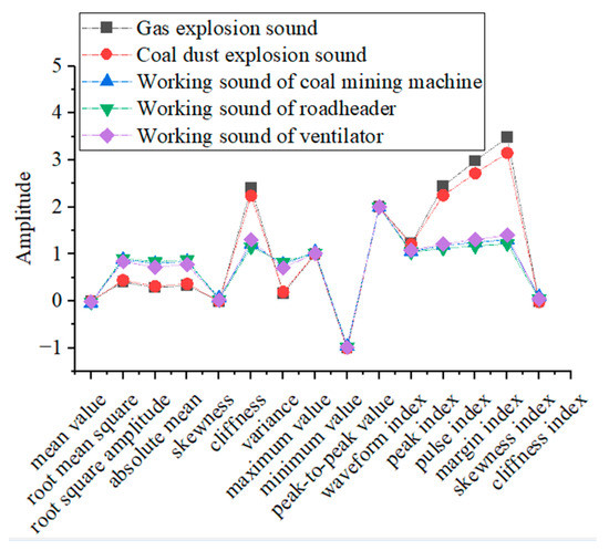 The time-domain features selected in this paper include the mean value, root mean square, root square amplitude, absolute mean, skewness, cliffness, variance, maximum value, minimum value, peak-to-peak value, waveform index, peak index, pulse index, margin index, skewness index, cliffness index, etc. There are a total of 16 parameters, which can describe the time-domain features of sound signals more comprehensively. The average values of the time-domain characteristics of gas explosion sound, coal dust explosion sound, coal mining machine working sound, roadheader working sound, and ventilator working sound are also extracted, and their specific distributions are shown in Figure 3.
