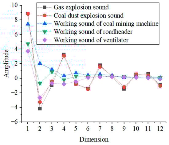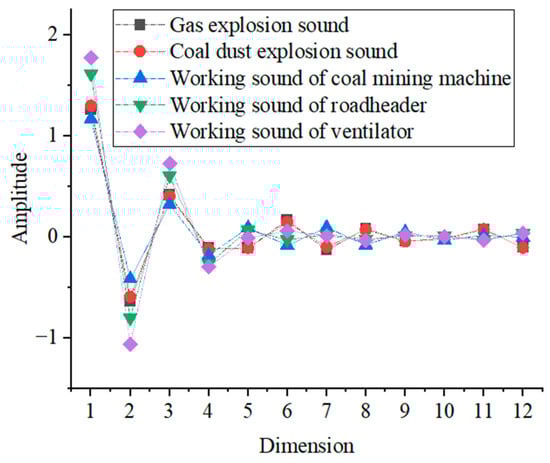 As can be seen from Figure 5, the mean values of GFCC eigenvalues of gas explosion sound and coal dust explosion sound are similar in size and have a similar distribution; the mean values of GFCC eigenvalues of working sound of coal mining machine and roadheader are similar in size in the first six dimensions of the mean GFCC eigenvalues, with little difference in size in the remaining six dimensions; the mean values of the GFCC eigenvalues of the working sound of the ventilator and roadheader in the last six dimensions are similar in value, and there is little difference in the value in the remaining six dimensions. The mean values of the GFCC eigenvalues of gas explosion sound, coal dust explosion sound, and working sound of the coal mining, roadheader, and ventilator have some similarities; there are small differences in the magnitudes of the values.