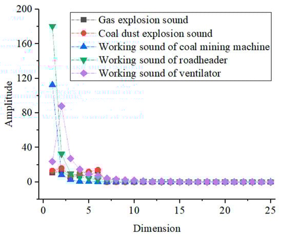 From Figure 6, it can be seen that the mean values of the short-time Fourier coefficients of gas explosion sound and coal dust explosion sound are similar in size, and the distribution is more similar.The mean values of the short-time Fourier coefficients in the 1st, 2nd, 4th, 5th, and 6th dimensions of the working sound of the coal mining machine have a large difference in size. The mean values of the short-time Fourier coefficients in the 1st, 2nd, 4th, 5th, and 6th dimensions of the working sound of the roadheader have a large difference in size, and the mean values of the short-time Fourier coefficients in the first six dimensions of the working sound of the ventilator have a large difference in size. The remaining 19 dimensions of the short-time Fourier coefficient average values are similar, and the similarity is high.