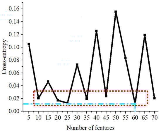In this paper, according to the steps in Section 2.3, to select the best feature parameters in the Relief algorithm output idx table to take the first 5, 10, 15, ..., 65, and 70 feature parameters into the MLP and calculate the cross-entropy distribution obtained for each group of feature parameters, the input model training is shown in Figure 7. As can be seen from Figure 7, the light blue marked point is the point with the smallest global cross-entropy value, corresponding to the number of feature values of 60 when the value of cross-entropy is 0.01184; however, the value of cross-entropy corresponding to the feature parameters in the red box line is less different from that when the number of feature values is 60. Therefore, in this paper, the recognition results corresponding to the number of feature values in the red box will be discussed and verified to select the optimal number of feature values.
