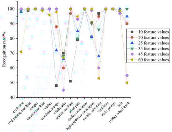 To select the best feature parameters for the model training, this paper also discusses the final recognition results of the recognition model after the corresponding feature parameters are input into the MLP to build the voice recognition model when the number of feature parameters is 10, 20, 25, 35, 45, and 60, and the specific results are shown in Figure 8. As can be seen from Figure 8, when the number of feature values is 60, the recognition result of the trained recognition model is the worst among several comparison models; therefore, the final recognition result of the recognition model is not directly related to the number of feature values. The recognition result of the sound recognition model proposed in this paper is better in gas and coal dust explosion sound, coal mining machine working sound, scraper working sound, and reloader working sound. The recognition results of the emulsion pump working sound, digging machine working sound, anchor machine working sound, wind pick working sound, mobile substation working sound, and rubber wheel car driving sound are poor; other sounds can be recognized by the recognition model after selecting suitable feature values.