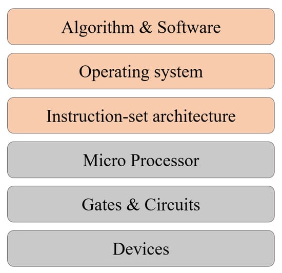 The power of quantum computing is currently mainly demonstrated by quantum algorithms. Given a problem, a quantum algorithm is constructed in the framework of a universal quantum computing model, such as the circuit model [6], or a Hamiltonian-based model [1,7]. An algorithm is realized by a sequence of elementary operations available in a model, such as CNOT gates and qubit gates [8]. However, for the modern design of computers [9], the above is not enough to guide the design of a real quantum computer. A computer system is far more complicated than a physical experimental device. From the hierarchy of the layers of abstraction, the physical devices and gates are at the bottom layer of the hierarchy, while algorithms and applications are at the top; see Figure 1. There is a gap between them. Some investigations on quantum high-level programming and layered design have been taken, e.g., Refs. [10,11]. Filling the gap, although it may take decades, is necessary to build real quantum computing systems.