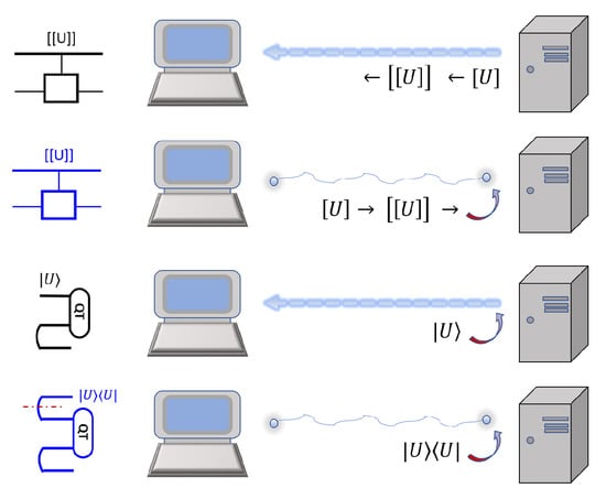 In practice, a host or data center may have a different design from a desktop computer. However, for simplicity we assume a quantum host follows a similar design to a quantum computer. The program may come from a host or another user. Without digging into the structures of a user or host computer, below we explain the elementary operations that need to be performed.