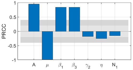 We analyzed the effect of the relevant system parameters on the criteria of the rumor-free equilibrium, using the partial rank correlation coefficients (PRCCs) method. In order not to lose generality, we set the input parameters to be uniformly distributed (a maximum value 120% of the baseline value; a minimum value 80% of the baseline value) and performed 1000 PRCCs on all parameters, as shown in Figure 2. Figure 2 shows rumor propagation is found to be strongly positively correlated with and strongly negatively correlated with . Our PRCCs results show that reducing the probability of rumor propagation and introducing a rumor detection mechanism can reduce the basic reproduction number.