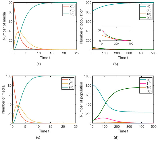 Numerical simulation results for the rumor-free equilibrium point , where (a,b) are numerical simulations of , (c,d) are numerical simulations of . (a) The stablity of rumor-free equilibrium on the media layer. (b) The stablity of rumor-free equilibrium on the population layer. (c) The stablity of rumor-free equilibrium on the media layer. (d) The stablity of rumor-free equilibrium on the population layer.