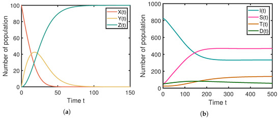 Firstly, we validated the global asymptotic stability of the rumor-free equilibrium point , as shown in Figure 3. By setting the system parameters according to the first row of Table 2, the results for are depicted in Figure 3a,b. It is evident that the rumor-free equilibrium point is globally asymptotically stable and converges to . Similarly, by setting the system parameters according to the second row of Table 2, the results for are shown in Figure 3c,d. It is apparent that the rumor-free equilibrium point is globally asymptotically stable and converges to . The simulation results align with the theoretical analysis.
