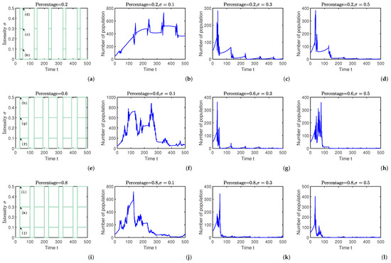 Lastly, we set the control time ratio to , as shown in Figure 5i. The simulation steps are the same as above, and as shown in Figure 5j–l, the results show the effectiveness of intermittent stochastic control strategy.