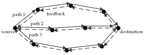 In a single-hop or single-route network scenario, the MAC scheduling algorithm determines whether each link queue transmits packets in the current time slot. In actual network scenarios, if there exist multiple alternative paths available between the source node and the destination node, it is necessary to allocate data traffic (i.e., arriving packets) to different paths reasonably based on MAC scheduling, so as to better balance the network load and obtain better transmission performance [3]. In a multi-path environment, as shown in Figure 1, we aim to ensure a reliable throughput capacity region for a multi-path MAC scheme that combines a distributed MAC scheduler and a data traffic allocation mechanism.