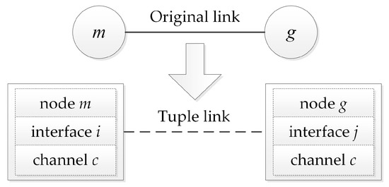 Reference [18] points out that using a tuple-based mathematical model can virtualize a multi-interface multi-channel network into a single-channel network. After virtualization, MAC scheduling strategies for single-channel environments can be extended to multi-channel environments, which evidently leads to better performance. Such a tuple-based mathematical model is employed in this paper. Under the tuple-based model, each node, interface, and channel are virtualized as a tuple node. The link between a pair of tuple nodes is defined as a tuple link, as shown in Figure 3. In practical networks, one can use a simple mechanism to implement this model. For example, in a certain time slot, tuple node (m, i, c) works means that the original node m works on channel c using interface i. The tuple link between (m, i, c) and (g, j, c) works means that node m uses interface i to send data to node g on channel c and node g uses interface j to receive data. After virtualization, the set of all tuple links in the network is denoted by L, and the set of tuple nodes is N. For convenience, in the remaining part of this paper, the word “node” is directly used to represent the tuple node, and “link” represents the tuple link.