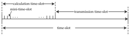 Step 2: Time slot segmentation. In order to make the implementation complexity of the MAC scheduling strategy independent of the network size, it is necessary to divide the time length of each time slot n into two parts: a calculation time slot and a transmission time slot, as shown in Figure 5. Furthermore, the calculation time slot is divided into P mini time slots. Within time slot n, each link selects one of the P mini-time-slots according to the mechanism proposed in step 3 as the starting time for data transmission.