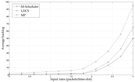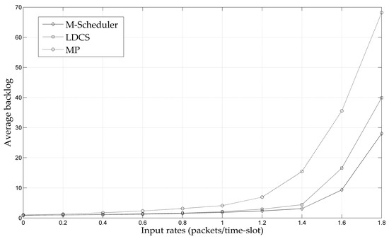 As shown in Figure 7 and Figure 8, under the three scheduling strategies, when the input load reaches a critical value, the average backlog in the network would sharply increase. Such a critical value of the input load can be considered as the boundary of the throughput capacity region. This phenomenon indicates that the three scheduling strategies are all throughput guaranteed. It can be found that the M-Scheduler proposed in this paper has the largest throughput capacity region among these three algorithms, which is consistent with the theoretical analysis. That is because M-Scheduler virtualizes multi-channel networks into single-channel networks, resulting in improved throughput performance. At the same time, the capacity region of LDCS is larger than that of the MP strategy. The reason is that LDCS adopts a relay-forwarding mechanism to complete data traffic allocation, which can better balance the network load.