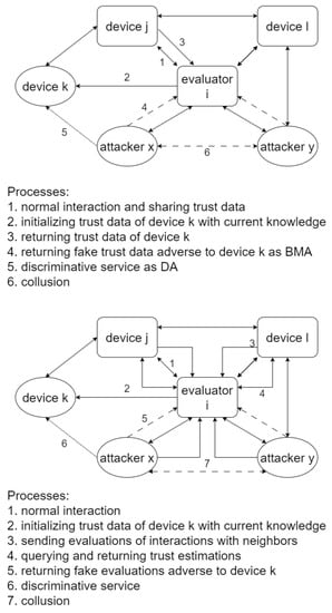 Apart from these challenges, malicious devices can mislead evaluators into producing incorrect trust estimations by launching trust attacks. It should be a consideration for trust mechanisms []. Roles played by contemporary devices are more and more complex. The social IoT is a paradigm of this trend, where researchers introduce the concept of human social networks to study relations automatically built among devices whose roles can shift between the requester and server []. It may render trust attacks more attainable and profitable. For example, malicious attackers collude to exaggerate conspirators and slander other devices, aiming at the monopoly of service providers in a network. On the other hand, it facilitates communication among devices with different views, which is very helpful in locating trust attackers.