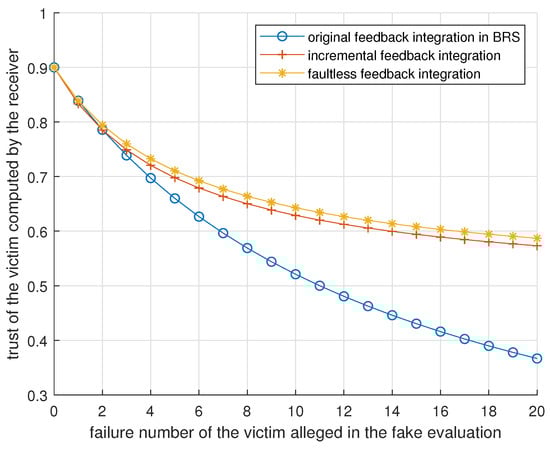 Feedback integration enables updating reputations using external evidence contained in evaluations from other devices to expedite the acquisition of accurate trusts. It also retards DAs by synthesizing evaluations of a device from diversified views. Derived from the combination of Jøsang’s belief model with Bayesian statistics and formulized with group theory, BTM’s feedback integration can serve as a more accurate extension of BRS []. As illustrated in Section 2.1, BTM includes two feedback integration algorithms, providing two trust evaluation styles producing virtually identical trusts. The answer to which better hinges on applications. We also compare these algorithms with their counterpart in BRS. Note that BTM does not adopt the common practice that computes a global trust estimation by weight-summing direct and indirect trust estimations like [,]. In BTM, when an evaluator receives a piece of feedback, it directly digests this feedback’s influence on a device’s trust into this device’s reputation.