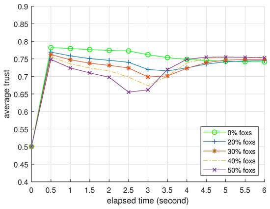 Average trusts of normal devices per 0.5 s, ; all attackers are foxes.