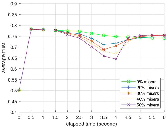 Average trusts of normal devices per 0.5 s, ; all attackers are misers.