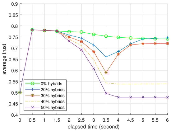 Average trusts of normal devices per 0.5 s, ; all attackers are hybrids.