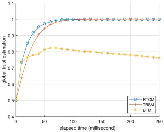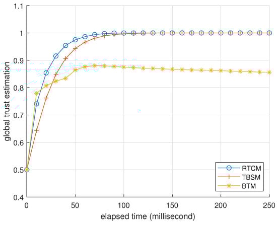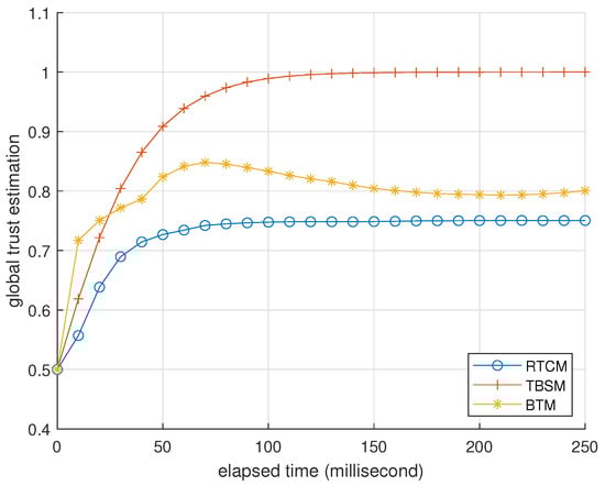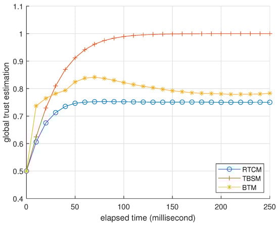 In this subsection, we compare the performance of BTM with a reliable trust computing mechanism (RTCM) [] and trust-based service management (TBSM) []. In both RTCM and TBSM, the forms of forgetting are conventional and similar to (10), and the global trust estimation is the weighted sum of the direct trust estimation from observation and the indirect trust estimation from feedback. RTCM features the utilization of feedback from multiple sources, where a fog node synthesizes direct trust estimations from devices and computes indirect trust estimations. The device requests indirect trust estimations from the fog node when it needs to compute global trust estimations. TBSM features comprehensive protection against trust attacks. As discussed in the Introduction, existing trust mechanisms have a common issue of dealing with trust attacks. The following simulation illustrates BTM’s advantage of reaching a good trade-off between the protection against BMAs and OOAs.