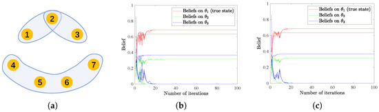 We first demonstrate the effectiveness of the HSL algorithms in reaching distributed consensus and the relationship with the underlying hypergraph connectivity. The structure of an unconnected hypergraph consisting of seven vertices and three hyperedges is depicted in Figure 1a. The non-zero values in the weight matrices A and B are randomly generated from and then normalized to satisfy the row-stochastic assumption. We assume there are three possible states , with being the true state. The initial beliefs are also uniformly generated from interval and subject to . Signals are assumed to be generated at each time from set and according to the probability distribution of and . Moreover, signal structures are set as , , , and , for . And for , we assume that , , , and . To be clear, we denote the discrete probability distribution that agents 1–3 follow as , while agents 4–7 follow discrete probability distribution . In this example, successful learning is considered to be reached if . If the collective consensus is not reached after 100 iterations, the learning ends on its own. Results in Figure 1b,c illustrate that an unconnected hypergraph structure may finally result in inconsistent learning results, which means the HSL strategies may not converge in such a case. This phenomenon accords with the intuition that completely separate groups may not reach a consensus.