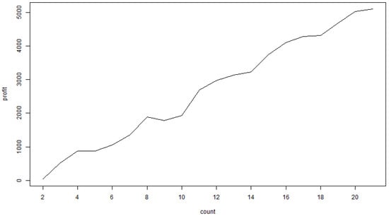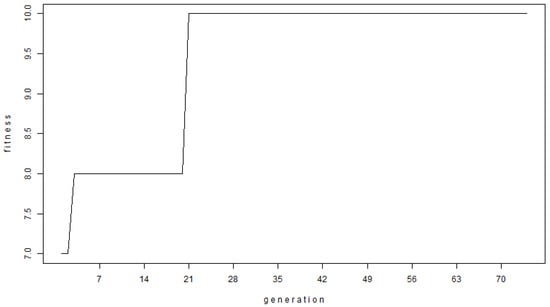 Figure 3 shows the optimization curve of the evolution algorithm. Figure 4 shows the learning curve of the evolution algorithm. As shown in Figure 4, the expected value of this logic tree is 5101, very close to the maximum expected value of the Dow Jones index time series (1–30 December 2022), which is 5308.
