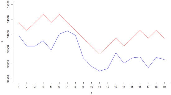 where denotes the t-th trade of the Dow Jones index, and denotes the average fluctuation of the closing price. The “machine economist” can use this value tree () to calculate the absolute value between two trading points of the Dow Jones index: