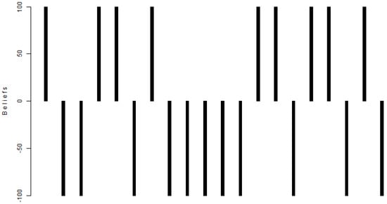 By applying Equations (19) and (20), the “machine economist” can then reconstruct the trajectory of the Dow Jones index, as shown in Figure 5 with 19 wins and 1 loss. The randomly selects strategy and strategy with 9 buy events and 11 sell events, as shown in Figure 6, very close to the market 10 times up and 10 times down. In Figure 6, a positive bar represents a buy action taken by the logic tree, and 100 means with 100% degrees of belief to buy; a negative bar represents a sell action taken by the logic tree, and −100 means with 100% degrees of belief to sell. The random actions taken by to buy and sell imply that the evolution algorithm believes the market is efficient, i.e., the market is walking randomly.