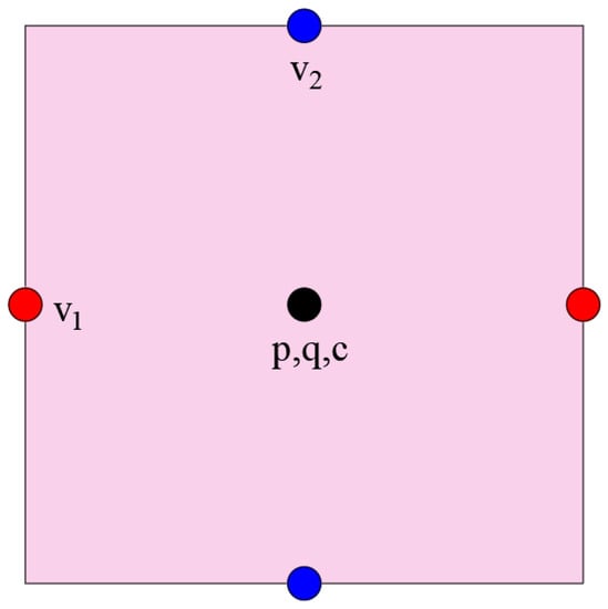 When applying the standard finite difference scheme directly in a standard Cartesian grid for the incompressible Navier–Stokes equation, the resulting numerical pressure is unstable. To address this issue, we use the second-order central difference scheme in the MAC grid configuration to provide a fully discrete scheme for the dimension splitting method above. In the MAC scheme [15], the unknown variable () is placed in different positions, as illustrated in Figure 1.