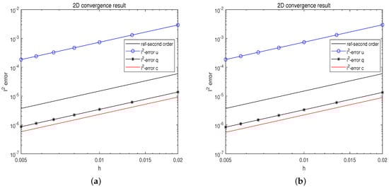 Figure 2a displays the errors for all unknown variables between the numerical solution and the precise solution at . It is clear that all unknown variables’ error trends are parallel to the second-order reference line, proving that the suggested technique is second-order convergent.