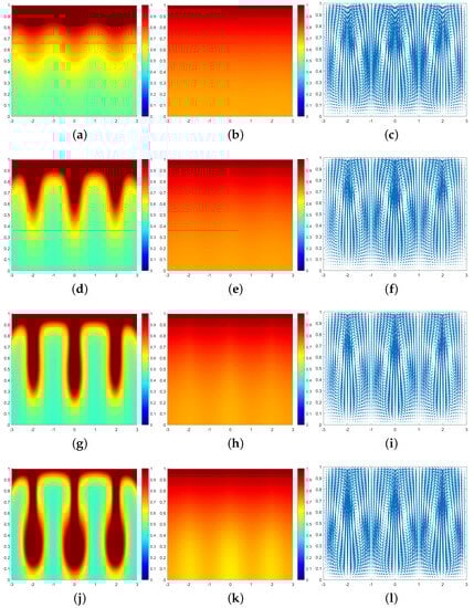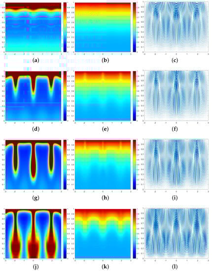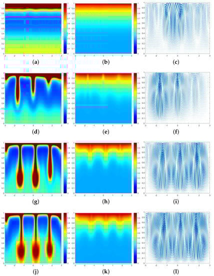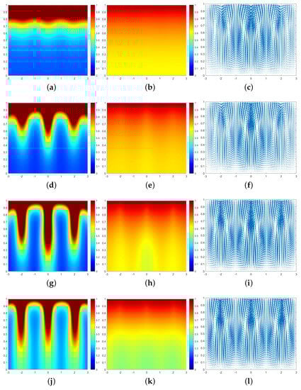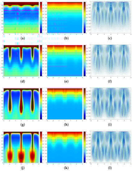 In Figure 3, we can see that at the moment , a large number of cells form a high-concentration cell layer on the air–fluid interface with sufficient oxygen. Due to the Taylor–Rayleigh instability, the biochemotaxis phenomenon occurs and the plume begins to appear. At , the plume sinks to the lower half and is finger-shaped. At , the lower part of the finger-shaped plume becomes larger. At , the finger-shaped plume changes to a mushroom-shaped plume. Upon examining Figure 4 and Figure 5, we can see that the plume appears earlier in each phase. Therefore, we can conclude that as increases, the finger-shaped plume appears earlier and faster, and the shape of the plume changes faster and faster. In other words, increasing the value of accelerates the sinking speed of the plume.