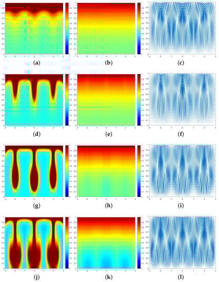 In all subsequent numerical result graphs shown, the first column is cell density q, the second column is chemoattractant concentration c, and the third column is the fluid velocity field . All large values of are painted the same shade of red in order to color and emphasize the plumes optimally.