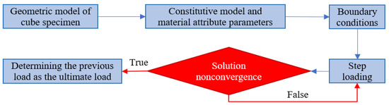 - According to the failure morphology of an ordinary concrete cube specimen, 12 key nodes (units) are set in the calculation model as monitoring points of plastic shear strain. Meanwhile, the coordinates of key nodes are loaded with the function ‘numpy.array( )’ in the Python computer language. In addition, the function ‘griddata( )’ is used to extract the plastic shear strain values of 12 key nodes under each level of load. Finally, the function ‘open( )’ is adopted to output the values of each level of load and the plastic shear strain values of 12 key nodes;
