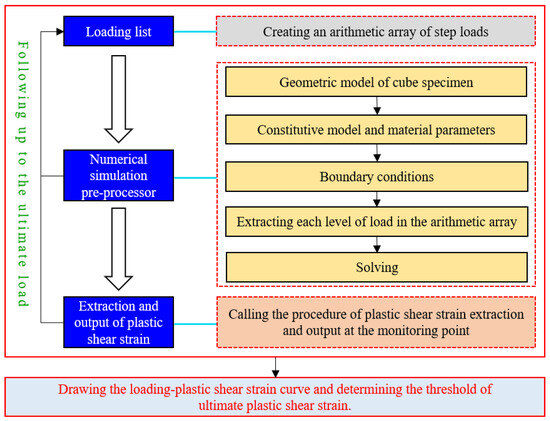 The key points of structural deformation weakness for the ultimate strain analysis of geotechnical materials have been normally selected. For instance, through the ultimate strain analysis of concrete blocks [22], 12 representative key nodes (elements) were chosen, and the load of each stage as well as the corresponding plastic shear strain values were extracted and output by means of the self-written Python program. Meanwhile, by comparing and analyzing the variation trends of the plastic shear strain of 12 key elements with the increase in axial load, the threshold value of the ultimate plastic shear strain of concrete material was finally determined. Therefore, the ultimate plastic shear strain in geotechnical engineering can also be obtained by the numerical limit analysis method, and the specific flow chart is depicted in Figure 3.