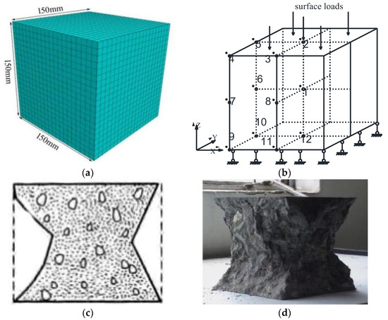 In this research, the finite difference software FLAC3D of version 6.0 is adopted to numerically simulate the C25 concrete cube specimen. First, the ultimate load of C25 concrete is determined by the overload method. The calculation model is a cubic specimen with a side length of 150 mm, and each side is divided into 20 grids, as shown in Figure 4a. Afterwards, the strain-softened plasticity model is employed, whose material attribute parameters are defined. Hence, the physical and mechanical parameters of C25 concrete are exhibited in Table 1. Furthermore, the bottom surface of the calculation model is fixed, while the top surface is subjected to a downward vertical plane load without considering the friction, as displayed in Figure 4b. According to the failure morphology of the cubic concrete specimen in Figure 4c,d, 12 key recording joints (elements) were set in the computational model (Figure 4b).