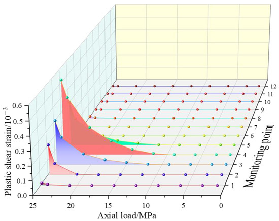 - Draw the ‘axial load-plastic shear strain’ curve of 12 key nodes (elements). Under the function of the ultimate load, the maximum value of the plastic shear strain occurs at the upper part or corners of the model [22], and the damage to the upper side elements will inevitably lead to the overall failure of the specimen model. Therefore, the maximum value of the plastic shear strain is taken as the ultimate plastic shear strain of geotechnical materials.